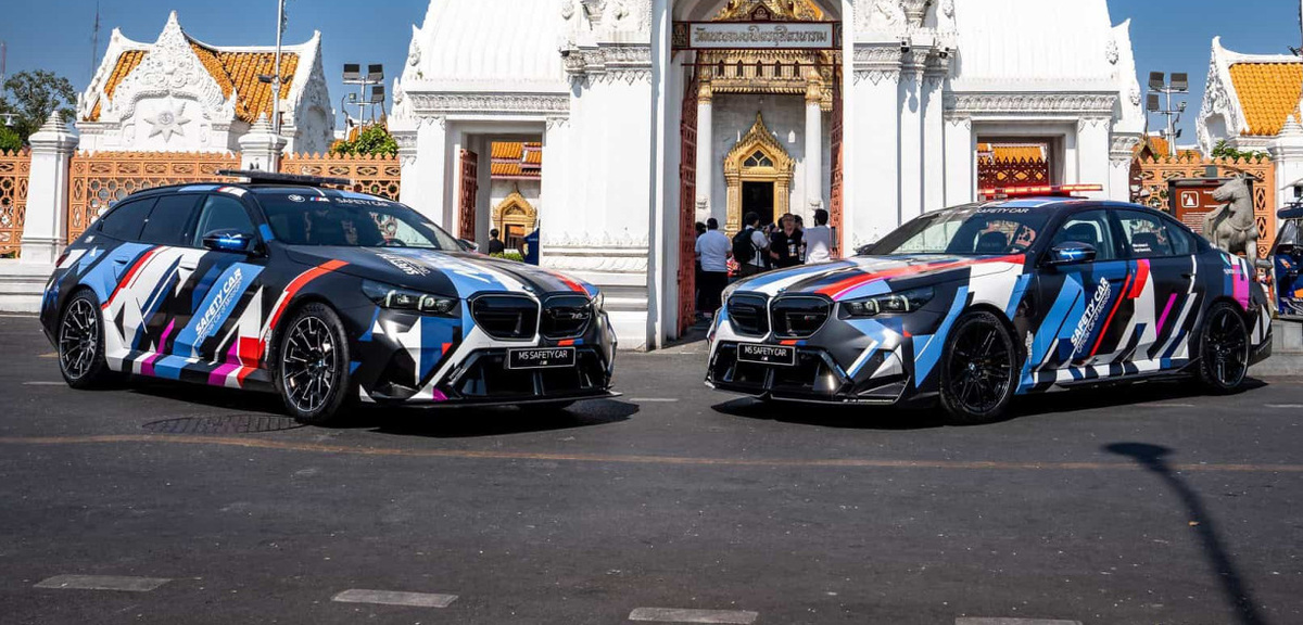 Седан G90 и туринг G99 появились вместе на публике в эти выходные во время мероприятия в преддверии сезона MotoGP. Шоу состоялось в Бангкоке, где динамичный дуэт щеголял в особой ливрее, украшенной цветами M. Если индивидуальная окраска кажется вам знакомой, то это потому, что она напоминает гибридный V8 M, используемый в гонках на выносливость, таких как IMSA и WEC. Два автомобиля безопасности M5 MotoGP останутся в Таиланде до начала сезона 2025 года. MotoGP проведёт первую гонку в выходные с 28 февраля по 2 марта, в течение которых Touring и дебютирует на трассе Buriram International Circuit. BMW поставляет автомобили безопасности, медицинские автомобили и мотоциклы безопасности для серии MotoGP с 1999 года. Стоит отметить, что седан уже был официальным автомобилем безопасности MotoGP. BMW впервые предоставила G90 в сентябре 2024 года для Gran Premio Red Bull di San Marino e della Riviera di Rimini в Мизано, также известного как Мото Гран-при Сан-Марино и Римини-Ривьера. Первая же го