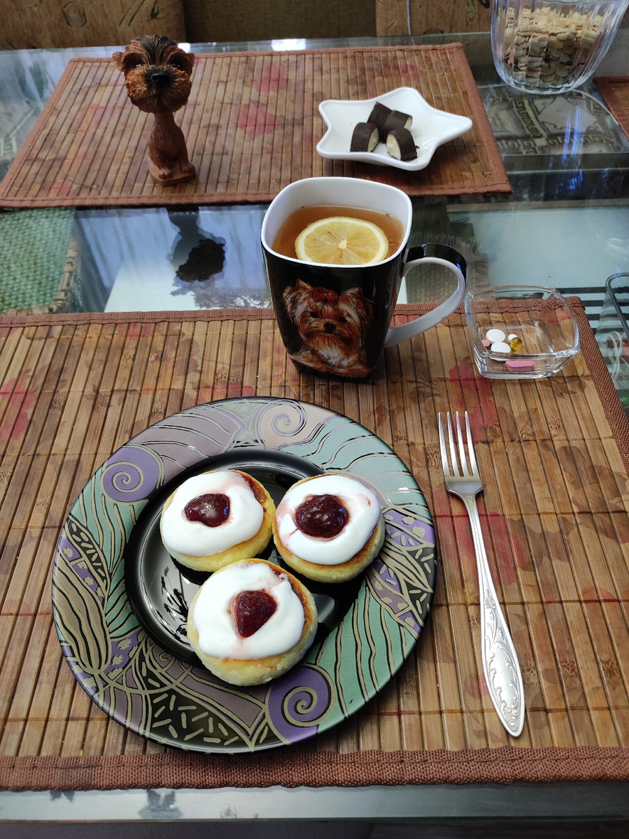 И это сырники. Такой завтрак у меня по субботам и воскресеньям. Ну вот не знаю, почему. Но сложилась сама собой такая традиция, что по выходным на завтрак я готовлю сырники. И тоже по одному и тому рецепту, которому не изменяю много лет. В миске смешиваю всё ингредиенты. Ещё добавляю 5 пакетиков Фитпарада. Хорошо всё перемешиваю. Без блендера. Просто вилкой растираю до однородной консистенции. Смесь готовлю вечером и ставлю в холодильник на ночь. Утром формирую 10 сырников и обжариваю с двух сторон на топленом масле. Моя порция три сырника + 30 гр сметаны+ 30 гр варенья + ягоды и фрукт. Такой завтрак 470-480 КК. Когда у меня есть время, я готовлю сырники и замораживаю. При разморозке и подогреве они такие же, как будто только что приготовленные. Как видите, я опубликовала три моих любимых завтрака. Готовятся быстро, просто. Из доступных продуктов. Калорийность этих завтраков почти одинаковая. Собирать свой рацион я начинаю с того, что заношу завтрак. Калорийность- то почти оди