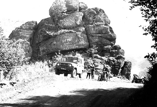 Вот решили с друзьями снова съездить на мотоциклах на побережье Татарского пролива в Бошняково. На этот раз собралась у нас компания покрупнее, - Урал с коляской и два Чезета. Наш путь лежит через всю западную гряду сахалинских сопок. Половина пути вверх в сопки до перевала, вторая – вниз до морского побережья. На перевале сделали остановку, встретили здесь попутный УАЗик. Перевал отмечен очень заметными скальными глыбами, исписанными именами «путешественников».
