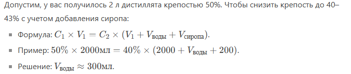 Соедините дистиллят, сироп и рассчитанный объем воды. Перемешайте деревянной лопаткой. Лайфхак: Если хотите крепость 43%, добавьте меньше воды — расчеты можно провести через онлайн-калькулятор дистилляторов. Заключение
