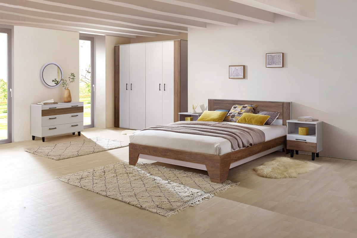 - Кровать — центральный элемент спальни, обеспечивающий комфорт и уют. Широкое изголовье и удобная конструкция кровати делают её не только эстетичным, но и функциональным решением.