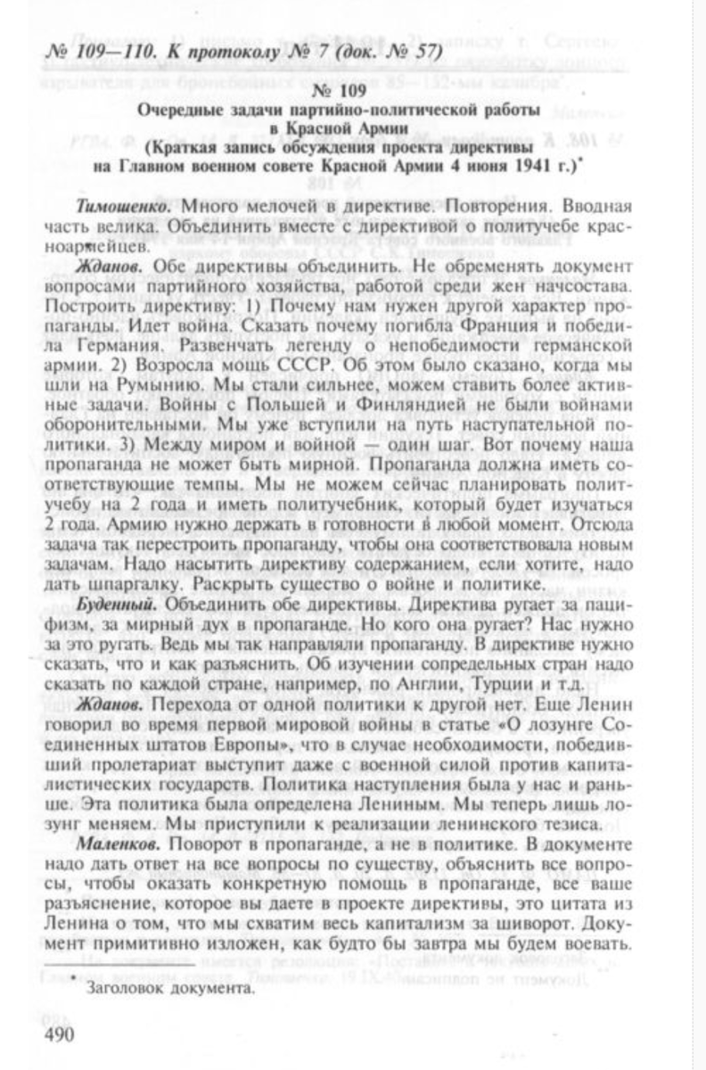 главный документ о мировой революции и советских планах наступать летом 1941 года все дружно не прочли, но проблем нет, в сборнике документов Главного военного совета (книга 2004 года издания) читаем обсуждение новой политической пропаганды, 4 июня 1941 говорит Жданов: "Перехода от одной политики к другой нет. Еще Ленин говорил во время первой мировой войны в статье «О лозунге Соединенных штатов Европы», что в случае необходимости, победивший пролетариат выступит даже с военной силой против капиталистических государств. Политика наступления была у нас и раньше. Эта политика была определена Лениным. Мы теперь лишь лозунг меняем. Мы приступили к реализации ленинского тезиса".