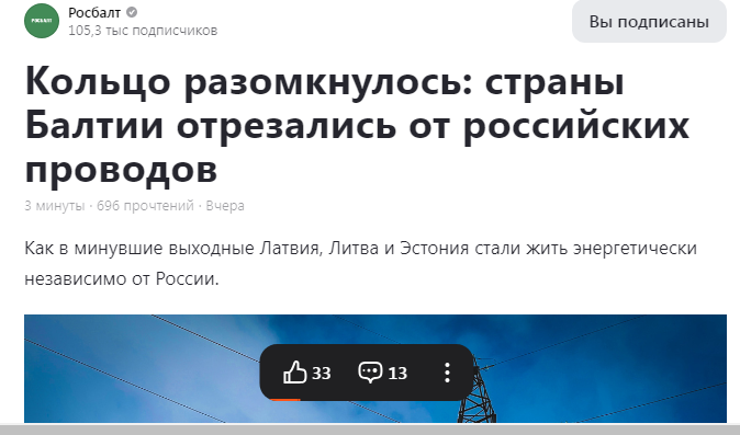 Всем привет! Итак, продолжается вполне закономерный, как я думаю, процесс. Идет разделение... В этой новости, по-моему, нет ничего удивительного. Помните, как во времена СССР мы, жители РСФСР, называли Прибалтику? Правильно, - "советская заграница"! Еще тогда прибалты своей психологией, да и просто бытом, здорово отличались от прочих советских граждан. Я в молодости много поездил по нашей стране (работа была такая, на строительстве и электрификации железных дорог), так что имел возможность сравнивать. А в Латвию впервые попал еще девятнадцатилетним студентом. И это был для меня культурный шок... Потом я одно время жил недолго во Львове. Вот этот город тоже был похож своей атмосферой на прибалтийские города, тоже был "заграницей"... Поэтому, конечно, да еще и в связи с событиями последнего десятилетия, мне вполне понятно решение прибалтийских государств по "вырезанию" себя из общей энергосети с Союзным государством... Ну и ладно! У нас-то всё равно всё хорошо, правда? А у некоторых так