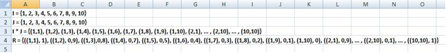 В материале представлены способы задания бинарных нечётких отношений, среди них есть способ номер 6 "в виде трёхмерного графика". Возможности MS Excel позволяют визуализировать бинарные нечёткие отношения этим способом. Рассмотрим следующий пример: построим бинарное нечёткое отношение под названием «натуральное число xi примерно равно xj» на универсальном множестве {1, 2, …, 10}. Для этого откроем лист MS Excel: 1) В ячейку A1 записываем перечислением универсальное множество I; 2) В ячейку A2 записываем перечислением универсальное множество J; 3) В ячейку A3 записываем перечислением элементов декартово произведение универсальных множеств I * J; 4) В ячейку A4 записываем перечислением элементов бинарное нечёткое отношение R: 5) В ячейки A7÷K17 записываем таблицу бинарного нечёткого отношения R, для этого: 6) Выделяем ячейки A7÷K17 в панели «Вставка» кликаем на «Другие диаграммы», выбирая в открывшемся подменю «Поверхность»: 7) Полученную диаграмму помещаем в пустую ячейку листа Excel,