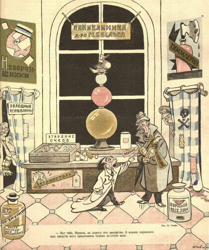 80 лет назад, в феврале 1945 года, главной мишенью насмешек советской прессы оставался, конечно, фашизм и Третий рейх. Юлий Ганф (1898—1973). «Паниклиника д-ра Геббельса. — Вот тебе, Михель, на дорогу эти лекарства. А взамен перевозочных средств могу предложить только летучую мазь». Февраль 1945. Среди аптечных средств: «бурный веселин, бодрин, оптимин, втирание очков, гиммлерин, неворчишники, холодные неуныванны, хи-хи-хинин (после употребления не разбалтывать)».