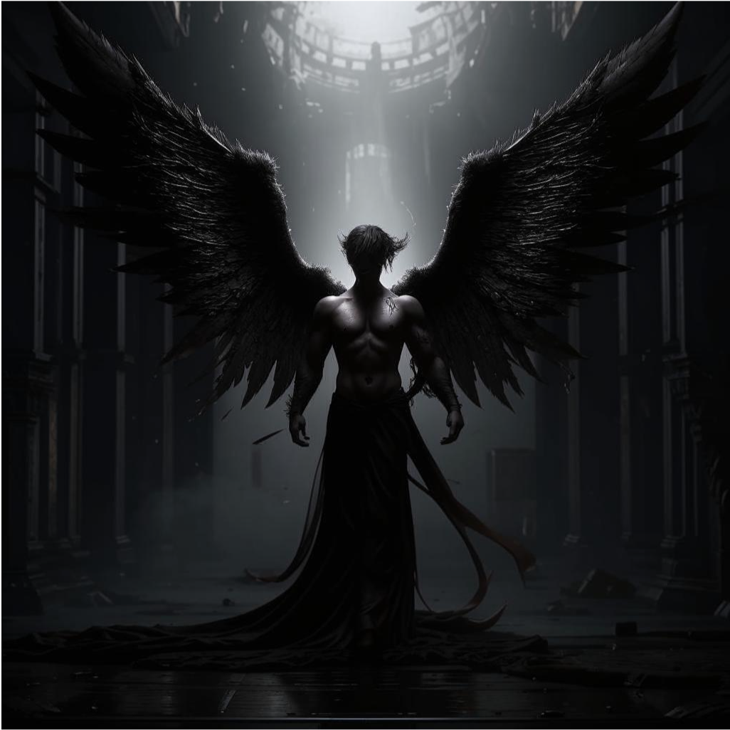 Его фигура выплыла из тени такой родной квартиры, словно сама тьма обрела форму. Высокий, с крыльями, чёрными, как смоль, и глазами, горящими холодным огнём. Он был прекрасен и ужасен одновременно. Его присутствие давило, как тяжёлый камень на груди, заставляя сердце одновременно замирать и биться чаще.