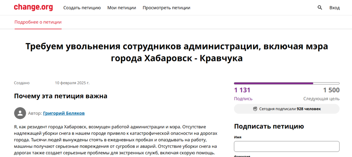 Новая рабочая неделя началась с транспортного коллапса по всему городу: пробки наблюдались на дорогах в течение всего дня. Основная причина заторов — несвоевременная уборка снега, и вина в нечищеных дорогах и завалах, по мнению многих хабаровчан, полностью лежит на администрации города. - Я, как резидент Хабаровска, возмущен работой администрации и мэра. Отсутствие надлежащей уборки снега привело к катастрофической опасности на дорогах. Тысячи людей вынуждены стоять в ежедневных пробках и опаздывать на работу, машины получают серьезные повреждения от сугробов и аварий. Отсутствие уборки снега также создает серьезные проблемы для экстренных служб, включая скорую помощь, — пишет в петиции Григорий Беляков. В пример хабаровчане ставят Южно-Сахалинск, где погодные условия гораздо более суровые. Но, несмотря на огромное количество снега, городские службы там смогли быстро очистить основные дороги. - Почему-то на Сахалине нет на дорогах наледи. А там осадков в три раза больше выпадает, чем у