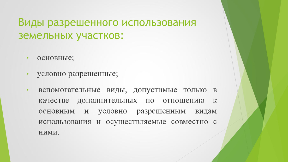 Как использовать земельный участок, какие объекты недвижимости строить, какие отступы от границ земельного участка и можно ли вообще строить? Перед покупкой земельного участка необходимо узнать вид его разрешенного использования (далее, ВРИ), который и определяет характеристики земельного участка. Основные и вспомогательные ВРИ земельных участков собственник выбирает самостоятельно без дополнительных разрешений и согласования путем внесения изменений в Единый государственный реестр недвижимости (далее, ЕГРН), за исключением земельных участков, находящихся в государственной собственности, в аренде. Для этого подаете Заявление о государственном кадастровом учете изменений объекта недвижимости через МФЦ либо через личный кабинет на Госуслугах. Относительно условно разрешенного вида использования земельных участков необходимо получение разрешения в местном самоуправлении. ВРИ земельных участков определены Классификатором ВРИ (Приказ Федеральной службы государственной регистрации, кадастра