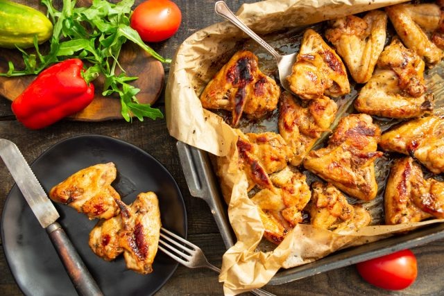 В семье юриста Лилии Туаршевой любят принимать гостей и блюда для угощения выбирают соответствующие - аппетитные, с ярким вкусом и чтобы на всех хватило. Вот, например, как по этому интересному рецепту. Ингредиенты: 1 кг куриных крылышек, 1 ст. л. меда, 2 ст. л. соевого соуса, 3 ст. л. растительного масла, 3 зубчика чеснока, 1 небольшая луковица, 1 ч. л. молотой сладкой паприки, 1 ч. л. молотой куркумы, соль и жидкий дым по вкусу. Тщательно моем крылышки холодной водой, убираем все лишнее. Разрезаем кожу возле предплечья. Ломаем в суставе самый маленький отросток крыла и вставляем его в разрез. Собранные таким образом крылышки поджарятся равномерно, не пригорят. Чеснок пропускаем через пресс, луковицу натираем на терке и все это отправляем к крылышкам и хорошенько перемешиваем. Насыпаем в миску сладкую паприку и куркуму. Добавляем мед, вливаем соевый соус, растительное масло без запаха. Если любите острые блюда, то в маринад добавьте немного чили или аджики. Пробуем на вкус, и если сол