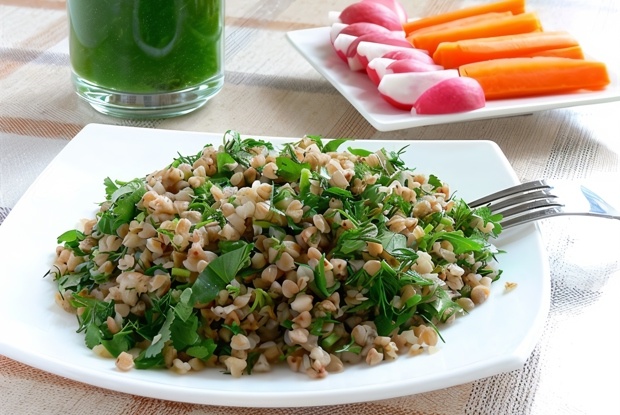 Готовую гречку разложите по порционным тарелкам. Добавьте оливковое масло, немного соевого соуса и лимонный сок. Для большей пикантности можно измельчить половину лимона вместе с цедрой и добавить в блюдо. Затем вмешайте нарезанные свежие травы: петрушку, кинзу и сельдерей. 3. Подача