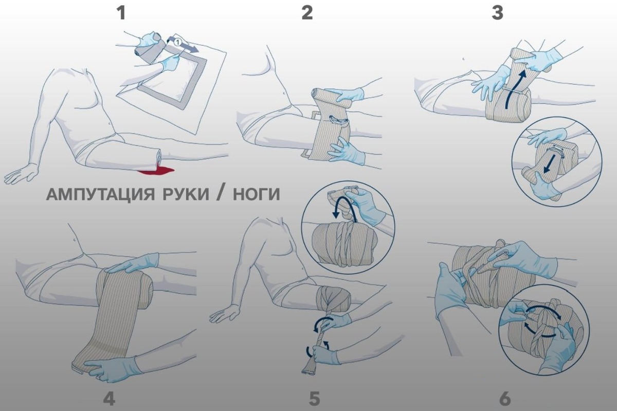 Травматическая ампутация — это отрыв конечности в результате травмы. Она может быть полной или частичной, когда конечность отделяется от тела полностью или частично. Иногда при частичных отрывах конечность в области повреждения и ниже выглядит как бесформенный мешок с раздавленным содержимым. Рана обычно сильно загрязнена. Для отрывов, полученных от движущихся механизмов, характерны обширные рваные и скальпированные раны. В некоторых случаях ампутированный отдел конечности разделяется на несколько фрагментов. Алгоритм действий: 1. Наложить жгут или турникет выше места отрыва. 2. Достать бандаж из упаковки и снять пластиковые ограничители. 3. Поместить ампутированную конечность в центр впитывающей подушки и обернуть повязкой. 4. Обернуть бандаж вокруг конечности и вставить край в аппликатор для оказания давления. 5. С усилием потянуть повязку в противоположном направлении и продолжать обматывать, закрывая все края впитывающей подушки. 6. Оставить свободный край длиной в 2–3 оборота. Его