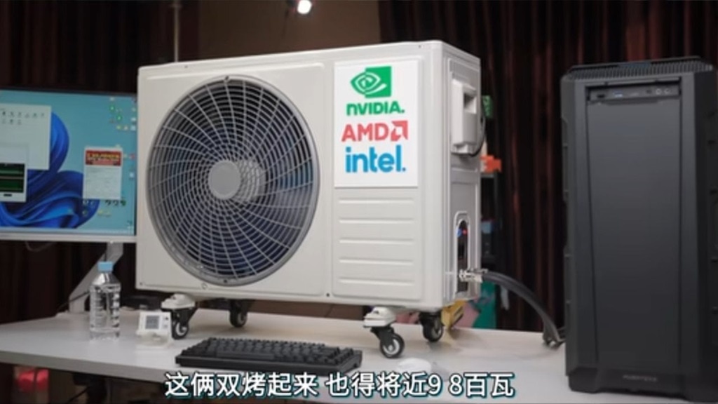 RTX 4090 по-прежнему используется для любопытных технологических экспериментов. Один из них пришёл с китайского видеоканала в котором используют обычный бытовой кондиционер для охлаждения видеокарты Nvidia. Конструкцию можно увидеть во всей красе на платформе bilibili. Сама система состоит из обычного корпуса ПК, рядом с которым размещен кондиционер мощностью 12 000 БТЕ от Xiaomi. БТЕ (британская тепловая единица) используется для обозначения охлаждающей способности систем кондиционирования воздуха и основана на описании тепловой энергии, необходимой для нагрева одного британского фунта воды на один градус Фаренгейта. Если рассматривать заявленные 12 000 БТЕ в контексте домохозяйства, то можно сказать, что кондиционеров с такой охлаждающей способностью примерно достаточно для поддержания комфортной прохлады в комнате площадью 50 квадратных метров. Возвращаясь к конструкции ESC: с помощью различных сварочных работ и подгонки труб энтузиаст техники сумел интегрировать контейнер для охлаж