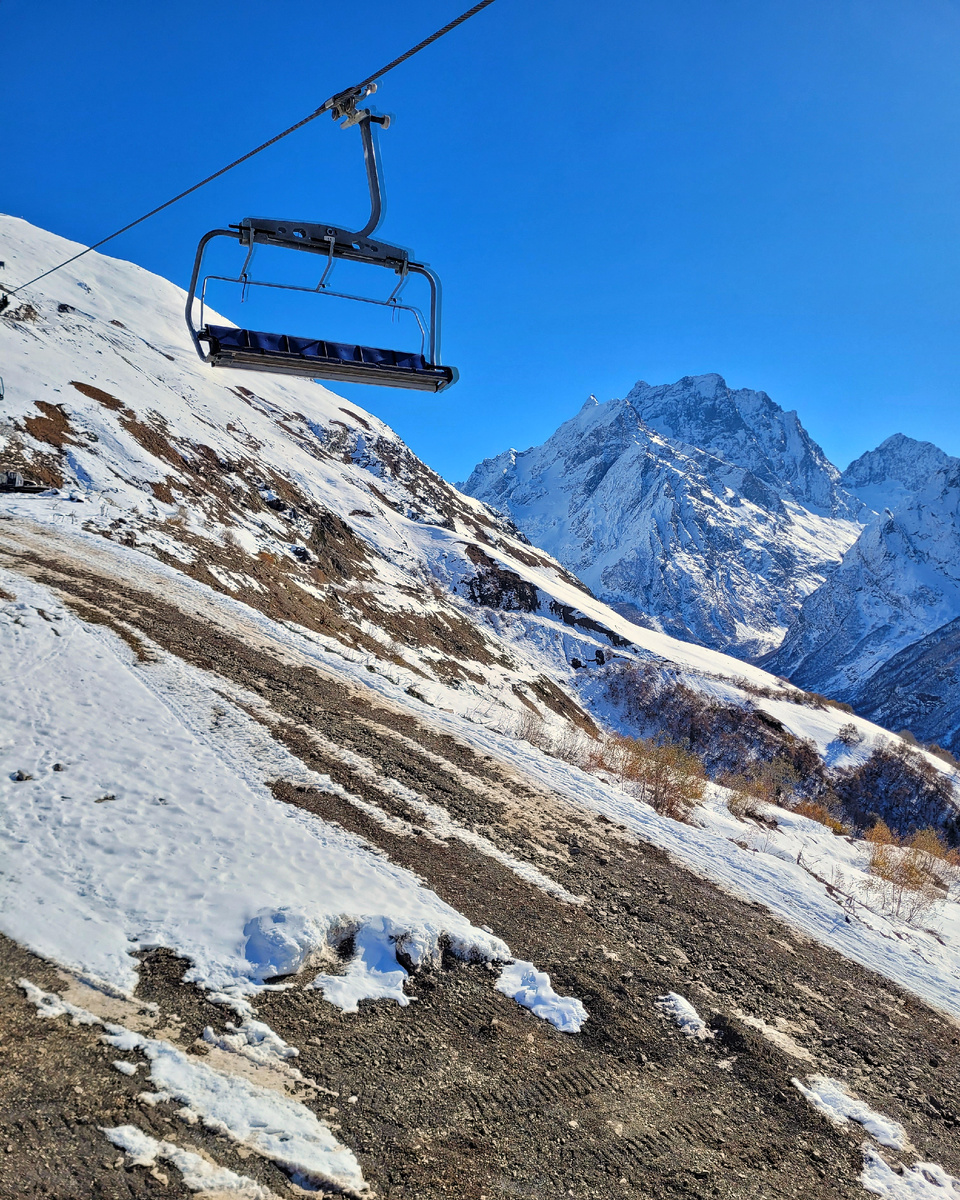 «Лыжи у печки стоят, гаснет закат за горой, месяц кончается март, скоро нам ехать домой. Здравствуйте, хмурые дни, Горное солнце, прощай! Мы навсегда сохраним в сердце своём этот край...» Строки из «Домбайского вальса» Юрия Визбора я помню с детства — песня звучала у папы из магнитофона. ...прочно ассоциировалась с советской походной романтикой — гитары, свитера, бороды))) Вот это всё в моём понимании было там — на Домбае. Хотелось доехать и ощутить. Но как-то долго не получалось. И когда я наконец добралась, уже никаких «лыж у печки»))) Времена-то изменились. ...осталась разве что гостиница в виде летающей тарелки, созданная в 70-ых, и то канатки сейчас до неё не ходят. Мы не смогли добраться, к сожалению. И советский недостроенный отель «Аманауз». Слышала сейчас, что его хотят сносить... Очень жаль — так эффектно выглядит. ...хотя, конечно, сами горы — как при Визборе. Вечные, мощные и по-прежнему недвусмысленно намекающие на сиюминутность людских проблем. Зарплату не дали, с подружк