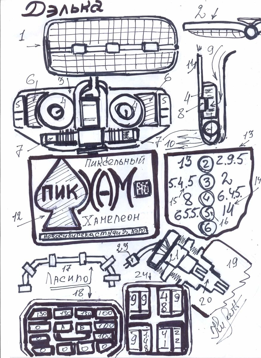 На рисунке 25, изображён тормозной реостат в разрезе, который устанавливается на машины, без функции аккумулирования электро энергии, короче на все кроме чистой электрички, и таких по одному, на каждое мотор колесо. Спереди электродвигатель (рисунок 26), далее нагнетатель (27), реостат (28), опускающиеся обтекатели закрытия и открытия воздуха заборника (30 и 31), и сам реостат (29). На рисунке 32 и 33, вид с переди на открытые и закрытые воздухозаборники. Ниже на рисунке 34 и 35, тормозная педаль или как у них называется "Реситка", так как весь тормозной комплекс называется РЕСИТО, или реостатная система торможений. Если у вас с крыши сняты реостаты, то Реситка электоро фиксатором (36) блокируется с упором в пол. На все инвалидные версии, РЕСИТО идёт в комплекте, а на гражданские по доплате, но у всех жителей Урала, Алтая и Кавказа, не снимаются круглый год. Управляется джойстиком, который может активировать реостаты передних колёс, задних, парно с любого бока, или одно по выбору. Моторы реостатов, запитываются от тяговых моторов во время торможения, но для дополнительной продувки, так же от основного генератора. А вообще, они там все экономят колодки, и круглогодично наяривают с реостатами на крыше, как Бэтмены. Ниже на рисунке 37, блок обхода основных релюшек машины. Однажды у меня на Калине, просочился радиатор салона, и рассолом залило реле топливного насоса, простоял на обочине около получаса, копаясь под рулём, пока сын по телефону, объяснял куда ставить перемычку. А там, если что, то открываешь панель, и если над неким переключателем горит красный индикатор, то щёлкни его и всё, система аварийно обведена. Я вот тоже, хочу поставить, прямое аварийное включение, на топливный насос, и включение вентилятора охлаждения. Ниже стандартный двигатель фирмы ВАЗ, как на бензиновую, так и на дизельную версии. Генератор рисунок 47, оппозиционный блок расположенных вертикально цилиндров 48. Две турбины 49, на каждую пару цилиндров, жалюзи 51, и радиатор 50. На всех машинах, бампер, передняя облицовка, жалюзи и радиатор, открываются единой калиткой, а затем из термоса, выкатывается блок - генератор, с вертикальным коленчатым валом. Чтобы заменить на СТО двигатель, при сдаче на плановый ремонт, и поставить временную прокатку, мастерам потребуется 15 минут, с контрольным тестированием правильной установки. А вот воруют (выкатывают) двигатели там у них, за 3 - 4 минуты, по ночам, с применением без шумной электрички Газели, оборудованной Болитрой ( БоЛиТр - борт, лифт, трап - в одном). Двигатель передне продольный, сверх долговечный, идеально продуманный, и как с коленчатым вертикальным валом, так и есть некий его аналог, очень узкий, запуск от тягового генератора, и вообще, признан шедевром автостроения. 38 - нагрудный монитор дорожного полицейского. 39 линейный фонарик, 40 источники инфра красного излучения для ночной съёмки, кнопка оплаты штрафов 42, монитор с верху 43, титановая бронебойная пластина 44, и вертикальные поролоновые демпферные рёбра. Если вы нарушили, то к вам подходит полицейский с монитором на груди, и на нём, появляется дежурный судья, который уже просмотрел запись вашего нарушения, он, просто смотря на вас с монитора, говорит (примерно так ) - Уважаемый Александр Владимирович, и поднимет свою Киянку (деревянный молоточек), с вас 2000 рублей, и после Киянкой ударяет о деревян