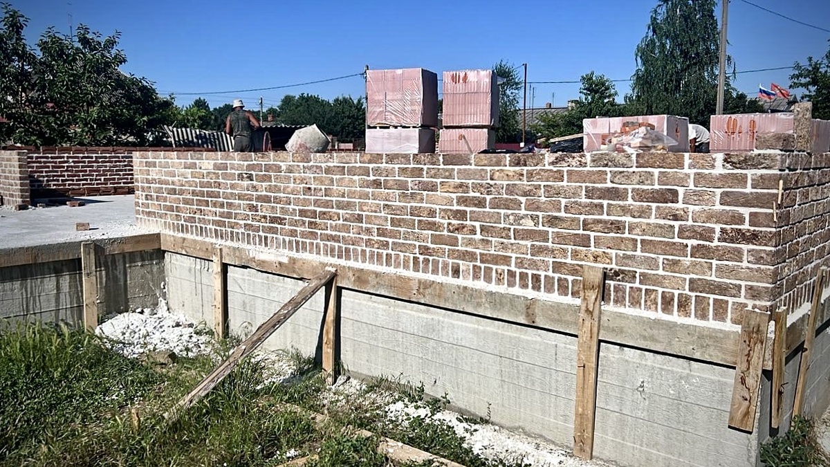 Первый слой - это лицевой кирпич. Внешний вид и технология производства напрямую влияют на стоимость кирпича. Второй слой – это утеплитель, можно использовать пенополистирол или пенопласт. Для юга России достаточно толщины 3 - 5 см. А если использовать теплую керамику для несущих стен, то слой утеплителя можно исключить. Третий слой – это несущие стены, они могут быть из теплой керамики, забутовочного кирпича, газоблока или из бетонного блока. В итоге толщина стены составит от 37 до 55 см в зависимости от выбранного типа камня для несущих стен и утеплителя. Первый этап – лицевой кирпич укладывается по периметру на высоту 1,5 метра, закладывается утеплитель. Второй этап – возводятся несущие стены на такую же высоту в 1,5 метра. Первый и второй этапы повторяются, пока стены не будут полностью готовы. В процессе возведения стен над окнами и дверными проемами устанавливаются железобетонные перемычки. Если п