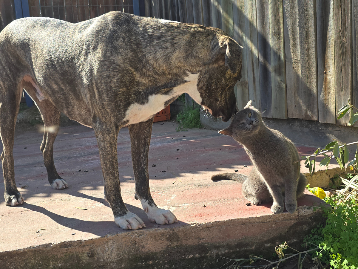 Панч, который впервые увидел котов только у нас, понял, что лучше быть котом, а не собакой. Поэтому он дружит с Мышкой, обожая её, играет с Шушу, моет Добби и контактирует с другими хвостатыми. Он видит, как я общаюсь с котейками. Беру на руки, глажу, сюсюкаюсь, целую. Иногда гоняю полотенцем. И собакен понял, что котом быть лучше. 🤣 Потому как собаку его больше наказывают и строже себя ведут с ним. Тут поясню. В чипе Панч записан как опасная порода и чтобы не было проблем со строгим законом, я занимаюсь с ним каждый день. И Панч уже отлично слушается. Он добрый малый, но без воспитания никак. И не каждому человеку объяснишь, что это просто большой котик. Подумаешь 41 кг веса и 66 см в холке))) Всё равно котик. Так что Панч лезет на колени, кучкуется с котами, когда те спят, ведёт себя как коты, старается подражать им. Если видит полотенце в руках и мой гневный шаг в сторону котов, чтобы разнять их (Радио и Веня жёстко бьются обычно), то бежит на своё место и замирает. Понимает,