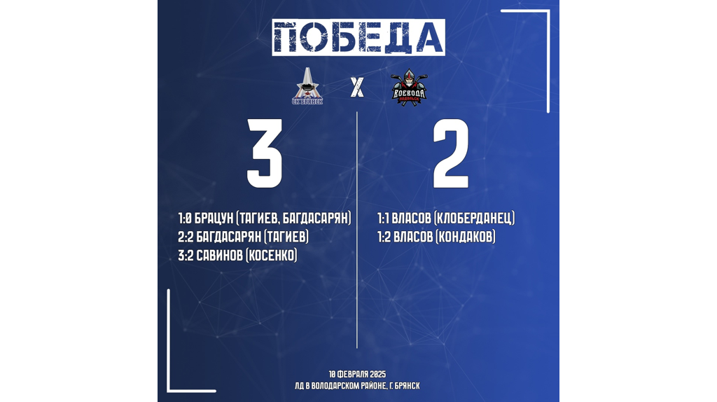 В очередном туре первенства НМХЛ ХК «Брянск» принимал на своем льду занимающий последнее место в турнирной таблице клуб «Воевода» из Подольска. Аутсайдер сумел навязать нашей ледовой дружине упорную борьбу. Гости были близки к победе, до которой им не хватило буквально нескольких мгновений. За 3 секунды до конца третьего периода они вели 2:1, но гол Георгия Багдасаряна перевел матч в овертайм. В дополнительной пятиминутке хозяева все же вырвали победу. Отличился Севастьян Савинов. Сегодня, 11 февраля, соперники сразятся вновь. Матч начнется в 19:00 в Ледовом Дворце в Володарском районе. Возрастное ограничение 6+ ХК «Брянск» в овертайме одолел «Воеводу» из Подольска