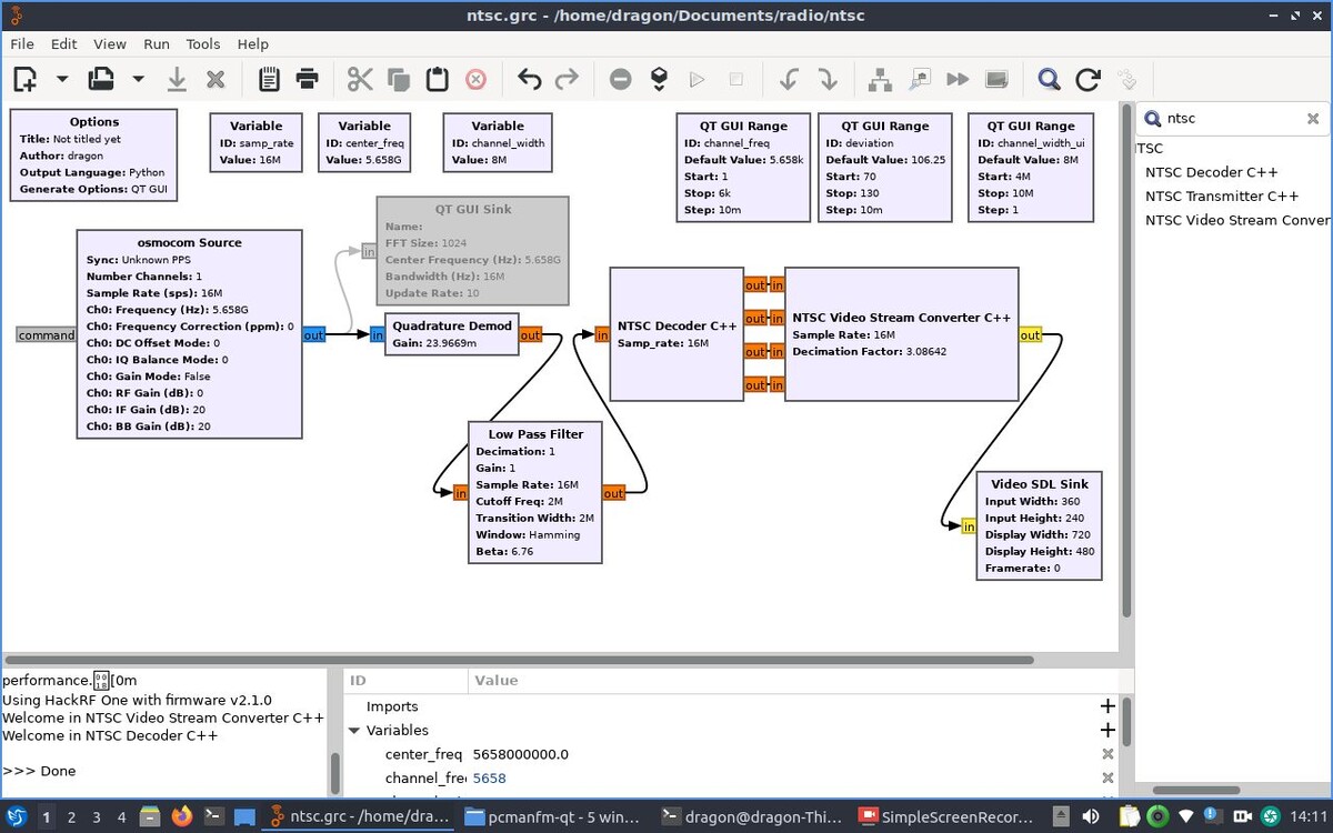 В предыдущей статье мы получили звук FM радиостанции: Здесь мы получим картинку с FPV аналогового видеопередатчика на частотах 5.8G, с использованием на приемной стороне SDR H4M и ПО GNU Radio. Рабочая схема потока: Картинка: Файл потока для GNU Radio: Особенности по производительности. Приведенная выше цепочка весьма ресурсоемкая в вычислительном плане. Цепочка запускалась на ПК с CPU 4 ядра (2 физических ядра), около 2ГГц. Картинка была стабильна, не было пропусков в данных (не было признаков "ОООО..." в терминальном окне GNU Radio). При выводе графиков или при записывании видео экрана начинали возникать пропуски в данных, картинка становилась не стабильна, CPU был нагружен на 90-100%. Поскольку H4M работает на частотах 1МГц-6ГГц, то можно распространить эту схему на другие частоты, другие аналоговые передатчики. Но, вероятно, не будет достаточно просто поменять рабочую частоту на предложенной схеме, т.к. внутри стандартов NTSC и PAL есть вариации и потребуется дополнительные танцы с
