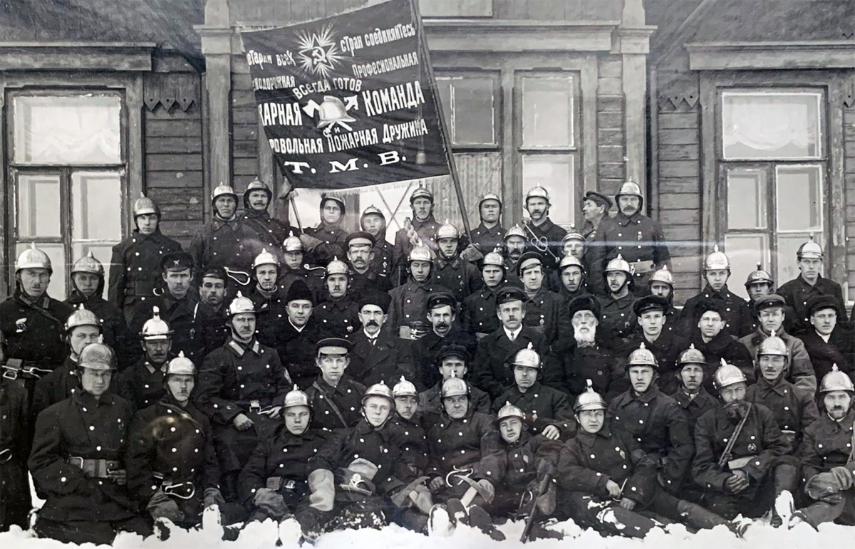 На снимке 1929 года добровольная пожарная дружина главных мастерских тяги Северной железной дороги (ТМВ). С 1935 года это Вологодский паровозовагоноремонтный завод, а с 1976 года - вагоноремонтный завод имени Калинина.