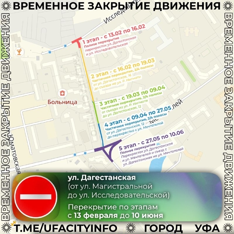 В последующем поэтапно будут закрывать две полосы дороги с четной стороны: с 16 февраля по 19 марта — от дома по ул. Дагестанской, 16 до съезда на ул. Рашита Нигмати; с 19 марта по 9 апреля — от съезда на ул. Рашита Нигмати и до ул. Дагестанской, 12; с 9 апреля по 27 мая — от ул. Дагестанской, 12 до перекрестка с ул. Мечтателей.