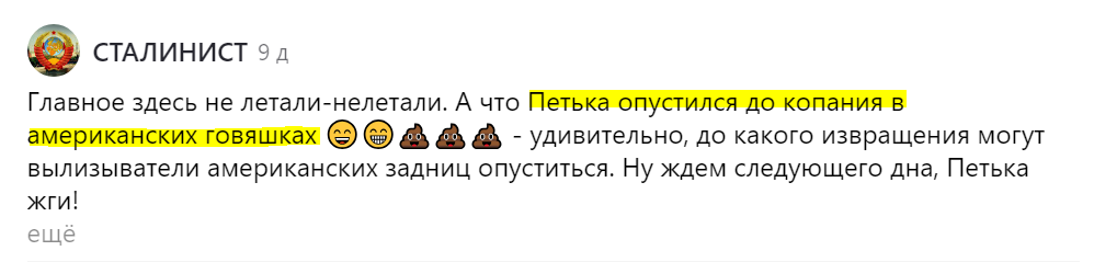Необходимое предупреждение о соблюдении мер техники безопасности при чтении этой статьи: 1) Тема в статье затрагивается малосовместимая с приёмом пищи. Я предупредил! 2) Статью не рекомендуется читать впечатлительным и обладателям тонкой душевной организации. 3) Тема может оказаться смешной. Для пущей сохранности компьютера при чтении воздержитесь от употребления напитков. Вроде с предупреждением всё. Переходим у животрепещущей теме. Я думал их после январской подборки попустило. Ан нет! Сначала пишут сортирно-дефекационные комментарии, потом этими-же руками возмущаются, что я тему поднимаю: Иначе как приписыванием оппоненту собственных заслуг коллективных нелетаистов это назвать нельзя. Ну, а раз уважаемым исследователям так хочется копаться в американских какашках, то пусть копаются. А я уж постараюсь, чтобы их хобби призвание было видно всем.