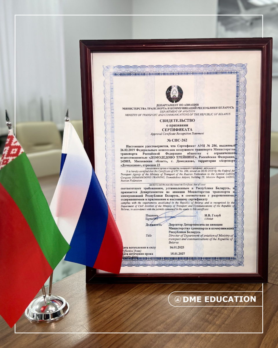 Департамент по авиации Министерства транспорта и коммуникаций Республики Беларусь удостоверил, что Сертификат АУЦ №286, выданный Федеральным агентством воздушного транспорта Министерства транспорта Российской Федерации ООО «ДОМОДЕДОВО ТРЕЙНИНГ», соответствует требованиям Республики Беларусь и признаётся на её территории. Теперь авиационные специалисты смогут проходить обучение с официальным признанием их квалификации как в России, так и в Беларуси. Это знаковое событие, произошедшее при поддержке коллег из Беларуси, укрепляет международное сотрудничество в сфере авиационного образования и открывает новые возможности для взаимодействия между двумя государствами в подготовке специалистов в соответствии с установленными требованиями.