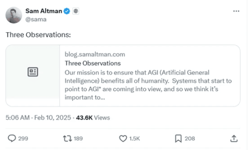 Сегодня в 5 часов утра соучредитель и генеральный директор OpenAI Сам Альтман опубликовал на своем личном блоге углубленную статью (Три наблюдения).
