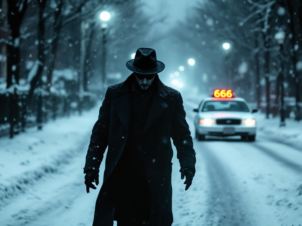 Виктор стоял на обочине, дрожа от холода и страха. Время шло, а такси всё не было. Он уже начал сомневаться, не было ли всё это галлюцинацией, вызванной переохлаждением, как вдруг вдалеке показались фары. Машина медленно приближалась, и Виктор с облегчением увидел, что на крыше горит знак такси. Когда она подъехала ближе, он разглядел номер: 666.