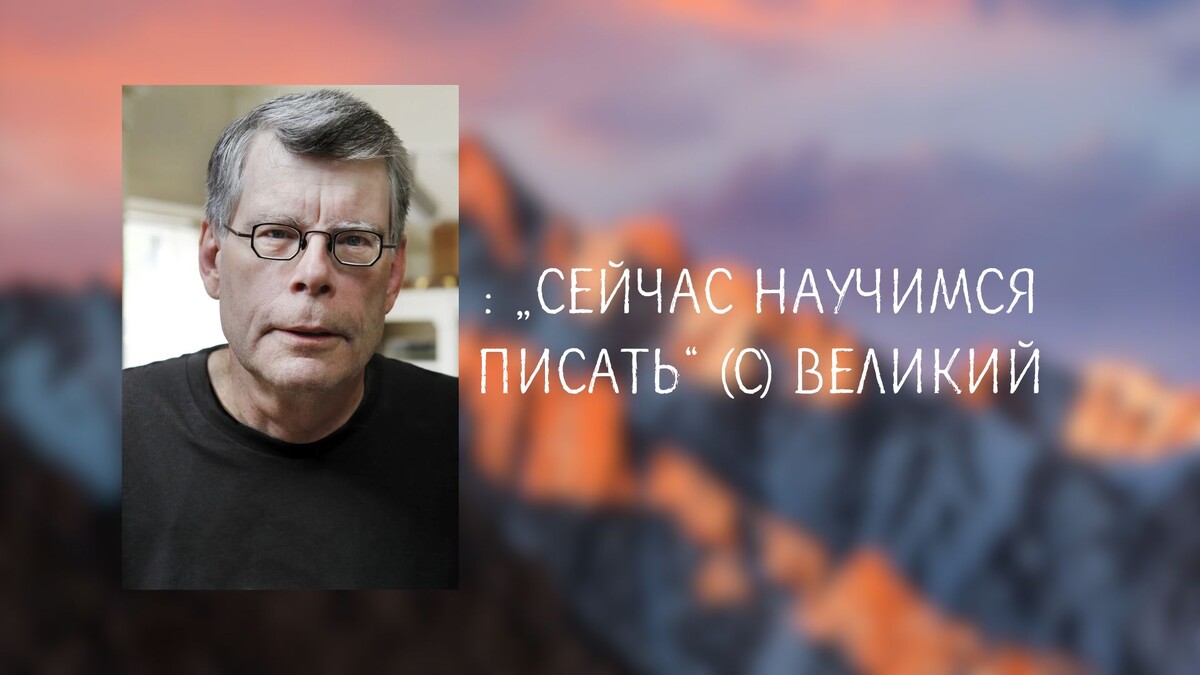 Прочитала книгу Стивена Кинга о том, как писать книги. Тут ограняю главные мысли, которые я почерпнула, а также привожу цитаты и примеры Великого (кто еще может наклепать 200+ животрепещущих рассказов?). В первой части статьи поговорю о трех китах классного письма и дам 6 советов о том, как писать лучше и эффективнее. Вернее, Кинг даст, но да ладно. #1 Словарь Кинг советует писать короткими, простыми и понятными словами – такими, которые с ходу приходят в голову. По-настоящему сильно испакостить свое письмо можно, если насиловать словарь в поисках длинных слов, потому что короткие как-то стыдно использовать. #2 Грамматика Выбирайте активный залог, чтобы текст оставался живым (Вместо «Дом был построен» – «Он построил дом»). Будьте осторожны с наречиями – они часто избыточны. Например, вместо «Он резко закрыл дверь» лучше сказать: «Он захлопнул дверь». В описании диалогов – с чем я отчасти не согласна – Кинг также советует максимально упрощать глаголы: лучше «сказал», чем «проскрежетал».