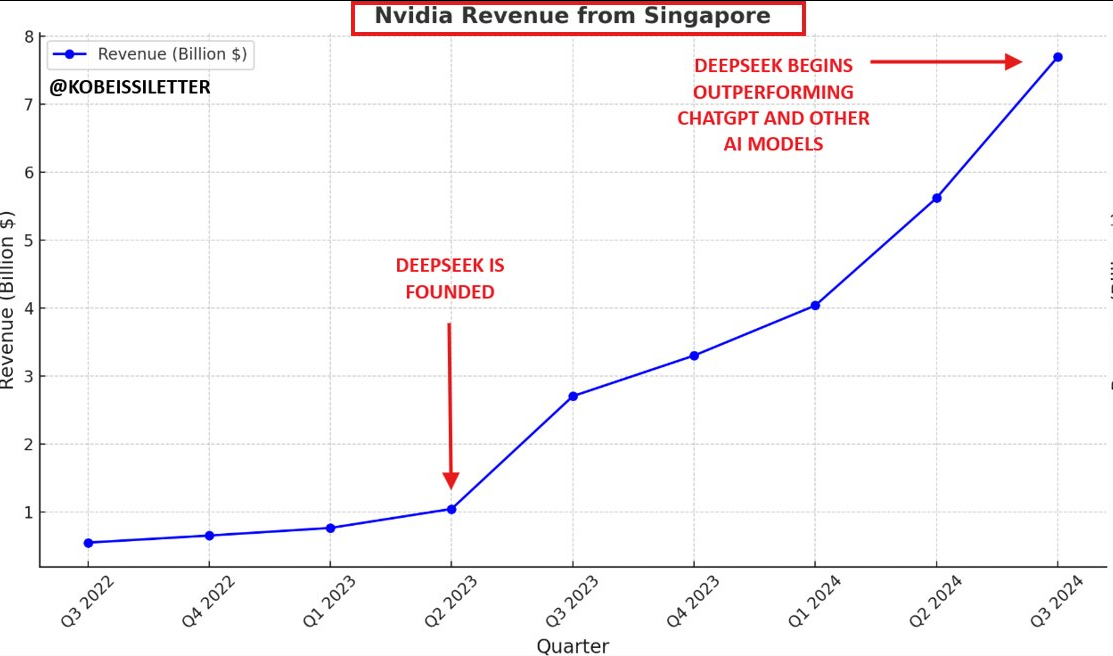 Все уже забыли про этот инфоповод и успели испугаться тарифов, но я решительно достаю из чулана китайский ИИ С момента основания #DeepSeek продажи #Nvidia в Сингапуре выросли на колоссальные +740%. И похоже, Маск был прав, что у них есть около 50 000 чипов Nvidia H100, о которых они не могут говорить из-за экспортного контроля США. Если учесть, что стоимость каждого примерно 30 000$ США + надбавка за серый импорт через третью страну, то мы получим затраты в 1,5-2 млрд долларов США. Совсем чуть-чуть больше заявленных 6 млн$. А если судить по избыточной выручке Nvidia из Сингапура, то кто-то закупился примерно на практически 6-7 млрд долларов ТОЛЬКО в 4м квартале 2024. Разумеется, это могли быть несколько потребителей. Слышал про еще одну страну под жесткими санкциями, которой чипы нужны, жаль что не для ИИ Сама компания честно отмечает, что большая часть отгруженной в Сингапуре продукции попадает к третьим потребителям. А рост продаж в Сингапуре на 535% за второй квартал 2024, например,