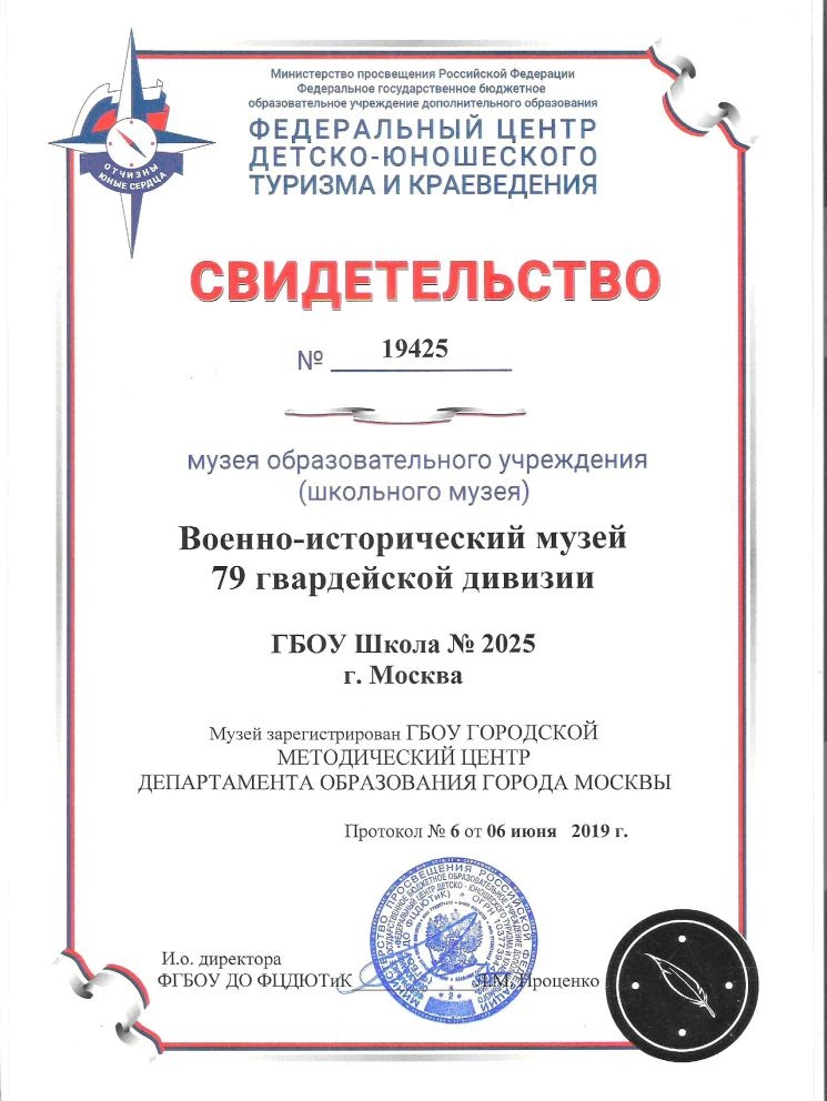 Военно-исторический музей 79 гвардейской дивизии ШКОЛЫ №2025, здание №2 ЗАО г. МОСКВЫ основан 29 октября 1977 года