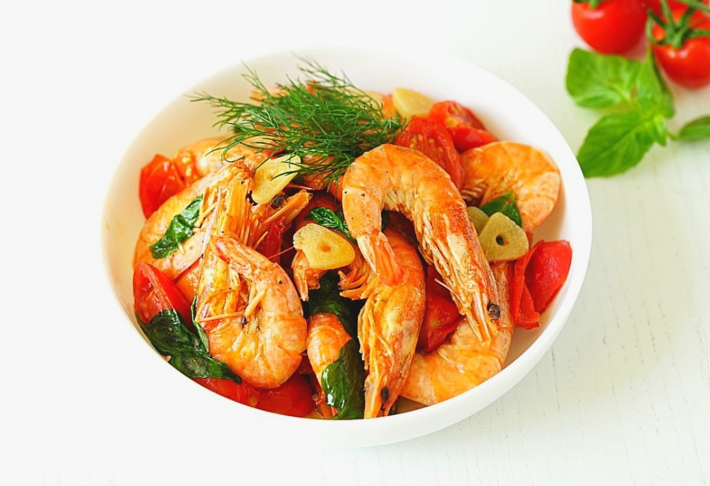 Подготовить все ингредиенты для жаренных креветок на сковороде. Лучше всего использовать крупные креветки в панцире. Приготовленные таким способом они сохраняют сочность, так как панцирь удерживает соки, мясо остается мягким и нежным. Размораживать их заранее не требуется – они быстро становятся готовыми прямо во время жарки. Для приготовления блюда можно взять креветки разного размера, в том числе и очищенные. Это позволит сэкономить время на приготовление. Важно помнить, что креветки не любят долгой готовки. Розовые креветки обычно уже готовы, поэтому их нужно только подогреть. В случае, если вы берёте серые креветки, а не розовые, то рекомендуется увеличить время их приготовления. Избавьтесь от шелухи на чесноке и нарежьте его тонкими пластинками Вымойте помидоры и обрежьте плодоножки. Нарежьте помидоры черри на две части. Используйте самые спелые и сладкие помидоры черри. Обычные помидоры не подойдут для этого рецепта. В крайнем случае, можно использовать обычные помидоры, предвари