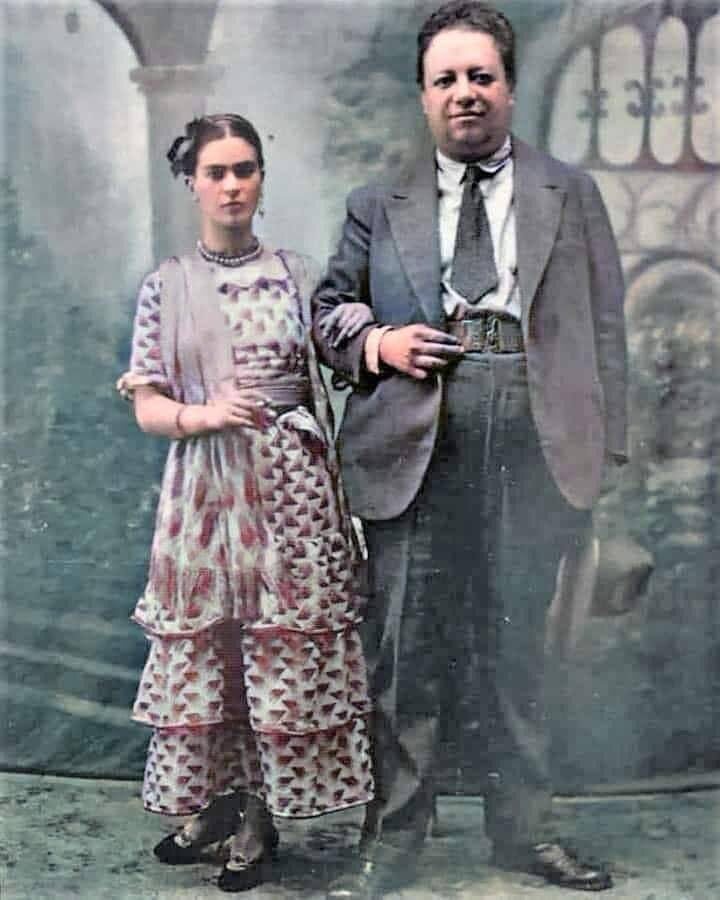Фотография сделана 21 августа 1929 года в Койоакане, Мексика. В этот день состоялось бракосочетание Фриды Кало и Диего Ривера. Кстати познакомились они когда Фриде было 15 лет. Кало поступила в “Preparatoria”, а Ривера расписывал холл учебного заведения. Это был конечно довольно странный брак. Маленькая, ярка, почти девочка Фрида, ей был 21 год. И огромный как по росту и комплекции, так и по его репутации Диего, которому уже исполнилось 43. Свадьбу справляли в доме их общей подруги Тины Модотти. Свадебное торжество тоже было довольно необычным. К примеру главное блюдо приготовила бывшая жена Диего модель и писательница Гуадалупе Марин. Женщина удивительной красоты, отличавшаяся взрывным характером и патологической ревностью. Мать Фриды, будучи благочестивой католичкой была вообще против этого союза. Она была разбита горем. Ведь ее дочь выбрала в спутники жизни атеиста и коммуниста. Родители Фриды ушли довольно быстро. А вот остальные гости продолжили торжества. Было уже далеко за полн
