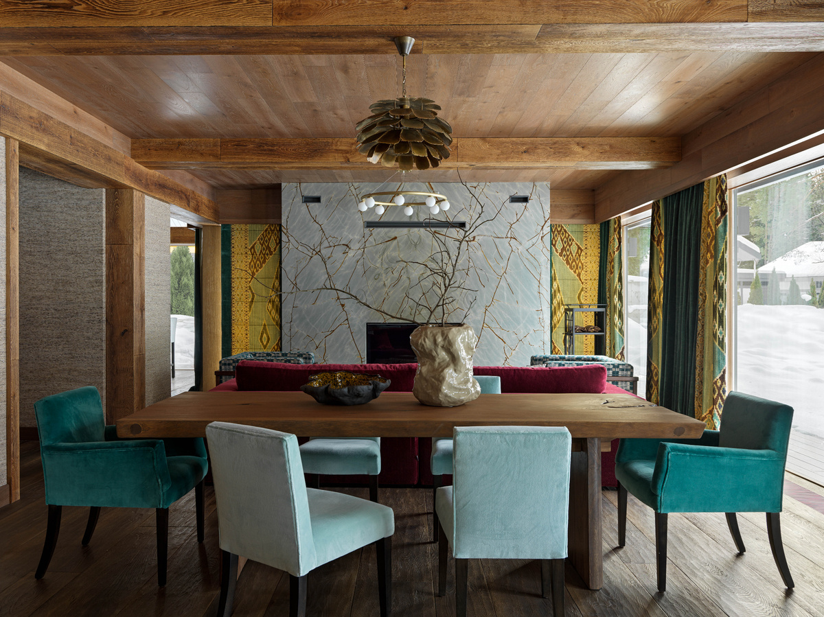 Дом расположен в коттеджном поселке «АртЭко» на Новой Риге. Изначально он представлял собой коробку с подведенными коммуникациями. Заказчик не боялся экспериментов и предоставил дизайнеру полный карт-бланш, хотя одно условие все же было: использовать только натуральные материалы. Даже гипсокартон оказался под запретом. Одно из главных достоинств дома — наличие большого количества окон, что позволило впустить солнечный свет даже в ванные и гардеробные. В целом все комнаты получились достаточно просторными и светлыми, например, площадь спален составила 20 и 30 м2, что идеально для частного дома. Интерьер продуман в стиле французских шале, но вместе с тем в нем присутствуют мексиканские мотивы, которые навевают воспоминания о путешествиях заказчика. Чтобы обстановка максимально располагала к отдыху, в гостиной сделали зону домашнего кинотеатра и установили камин, облицевав его кварцитом серо-голубого оттенка. И это не просто облицовка, это мраморная стена, как глыба живой природы, котор