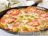 Продукты (на 8 порций) Для основы: Картофель очищенный - 450 г Яйцо куриное - 1 шт. Мука - 1 ст. ложка Чеснок сушеный - 1 ч. ложка Травы итальянские - 1 ч. ложка Соль - по вкусу Перец черный молотый - по вкусу Для начинки: Колбаса (ветчина) - 80 г Помидоры - 1-2 шт. Лук репчатый - 0,5 шт. Оливки - 10 шт. Сыр сулугуни - 150 г Кетчуп - 3 ст. ложки Чеснок - 1 зубчик Подготовить продукты для основы картофельной пиццы. Очищенный картофель натереть на терке. Выложить картофель в сито, промыть холодной водой и хорошо отжать. Добавить в картофель яйцо, соль и специи. Перемешать. Всыпать муку. Хорошо перемешать до однородности. Нагреть сковороду диаметром 26 см, немного смазать растительным маслом. Ложкой равномерно выложить на сковороду картофельную массу. Обжарить на сильном огне 2 минуты, затем накрыть крышкой, огонь уменьшить и готовить еще 5 минут. Перевернуть картофельный "блин" на другую сторону и обжарить таким же образом. Подготовить ингредиенты для начинки. Чеснок пропустить через пре