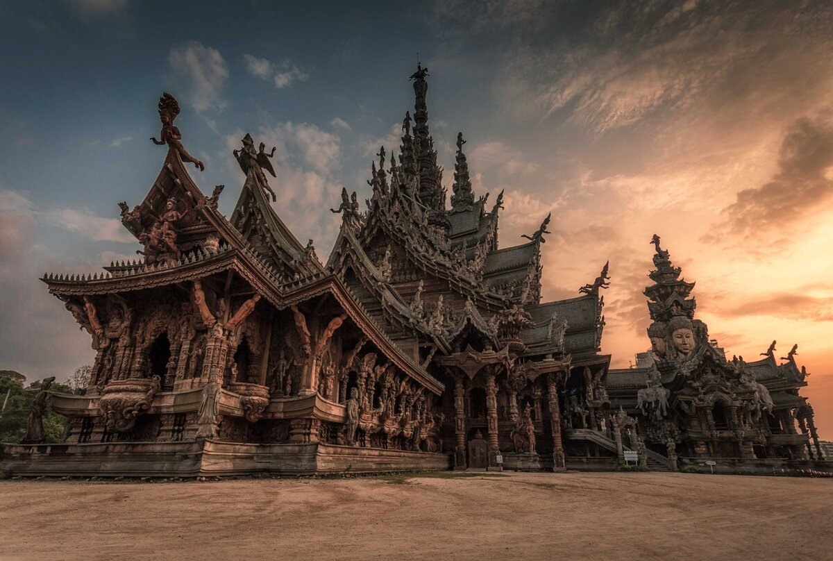 Храм Истины (Wat Phra Yai) — это одно из самых знаковых и уникальных мест в Паттайе, Таиланд. Этот великолепный храмовый комплекс, построенный в традиционном тайском стиле, привлекает туристов со всего мира благодаря своей необычной архитектуре и глубокому философскому смыслу. Строительство Храма Истины началось в 1981 году и продолжается по сей день. Храм выполнен полностью из дерева, что делает его уникальным среди других храмов в регионе. Каждое дерево, использованное в строительстве, было тщательно отобрано и обработано вручную. Это создает не только эстетическую привлекательность, но и подчеркивает уважение к природе и ее ресурсам. Одной из главных особенностей храма являются его резные детали, которые изображают различные сцены из буддийской и индуистской мифологии. Эти резьбы не только красивы, но и наполнены глубоким смыслом, отражая философские идеи о жизни, любви и поиске истины. Храм Истины построен как символ поиска истинного знания и понимания. Его архитектура и оформление