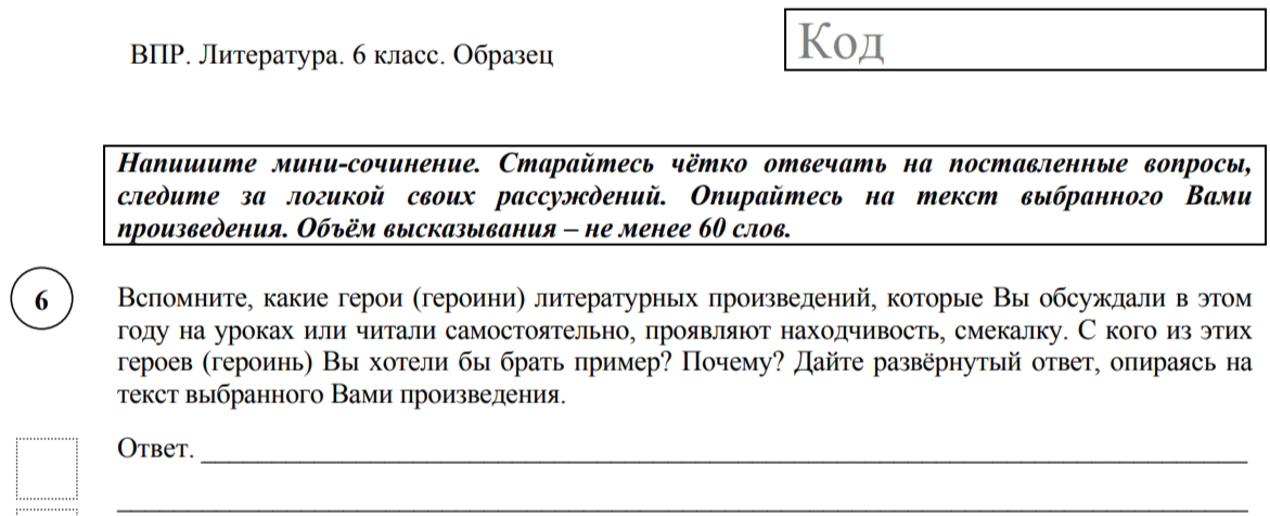 В задании №6 ВПР по литературе предлагается написать мини-сочинение, которое представляет собой ответы на поставленные вопросы. Ниже предложен шаблон для написания сочинения. Он включает в себя тезис, пример из литературного источника, развёрнутый ответ на вопрос, вывод.