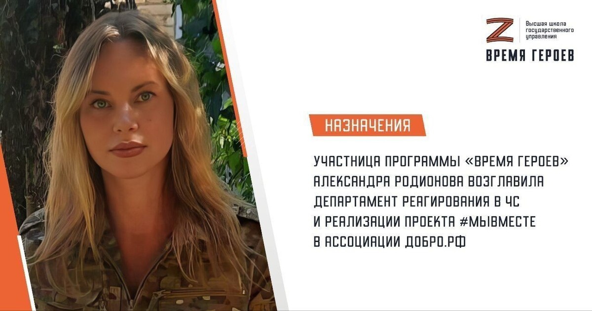 Участница программы «Время героев» Александра Родионова была назначена на должность руководителя департамента реагирования на чрезвычайные ситуации и реализации проекта #МЫВМЕСТЕ в Ассоциации Добро.рф. В мае прошлого года она вошла в число 83 участников программы «Время героев». Александра Родионова отметила высокое качество подготовки в программе и подчеркнула, что в новой роли сосредоточится на работе с воссоединенными и приграничными регионами страны. «Обучение было насыщенным и охватывало все аспекты управления. Это не только получение новых знаний, но и возможность практики и обучения у высокопрофессиональных экспертов. Я продолжу свою работу с воссоединенными и приграничными регионами, а также с территориями, которые сталкиваются с чрезвычайными ситуациями, для организации квалифицированной помощи там, где она наиболее необходима», – выделила она. Председатель комитета Госдумы по молодежной политике и председатель Совета Ассоциации Добро.рф Артем Метелев выразил уверенность, что