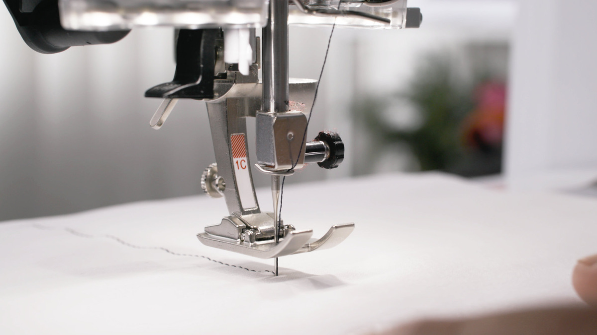 Тонкие ткани также идеально шить прямой строчкой с этой лапкой и игольной платиной. Отсутствие ширины гнезда не позволяет «затянуть» токую ткань в гнездо, а также удобно шить мелкие и острые детали углов.