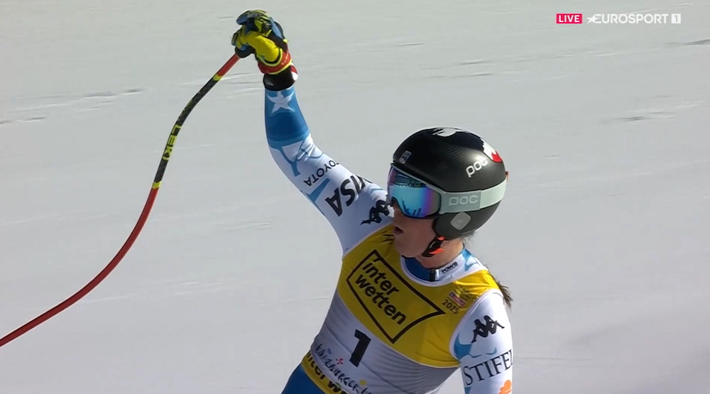 А теперь – интересный момент: Бризи Джонсон – новая чемпионка мира в скоростном спуске – появляется на старте. Но в субботу она стартовала первой, а сегодня уходит на трассу 13-й. Она проигрывает полсекунды уже на втором отрезке. Понятно, что Бризи очень волнуется, ей надо не подвести Микаэлу. Американка уступает 49 сотых секунды на четвертом отрезке, сокращает отставание, очень быстро проходит низ и финиширует третьей! Она отыграла довольно много на финишном спуске, и от времени Айхер ее отделяют 28 сотых секунды. Пухнер она проиграла 23 сотых.