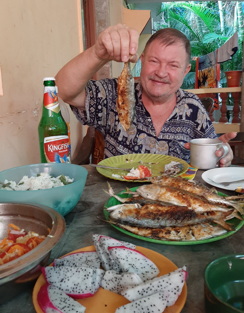 Сегодня внезапно все собрались дружно на пляже. Купались, гуляли и тут выяснилось, что муж моей подруги встал в 7 утра и отправился за рыбой на пляж. Нашел рыбаков и купил у них только что выловленной рыбки неизвестного сорта. Рыбу он с утра почистил и поставил в холодильник, а на пляже тихо начал выяснять, а не хочет ли кто эту рыбу пожарить. Я изъявила желание. В 12 часов дамы пошли на массаж, а я с мужчинами попыталась ловить рыбу в море при помощи каких-то странных приспособлений. Ничего не получилось, но мы зато наплавались до посинения и пошли домой жарить то, что имели. Скажу я вам, что вкус свежей рыбы не сравним ни с чем. Повторюсь. Это отличалось от того, что мы едим дома, как тигр настоящий о тигра нарисованного. К столу подавали пиво, салат из помидоров и драконий глаз. Отвели душу любители рыбы. Наверное повторим. Мы все ещё не можем налюбоваться морем, нарадоваться солнцу.