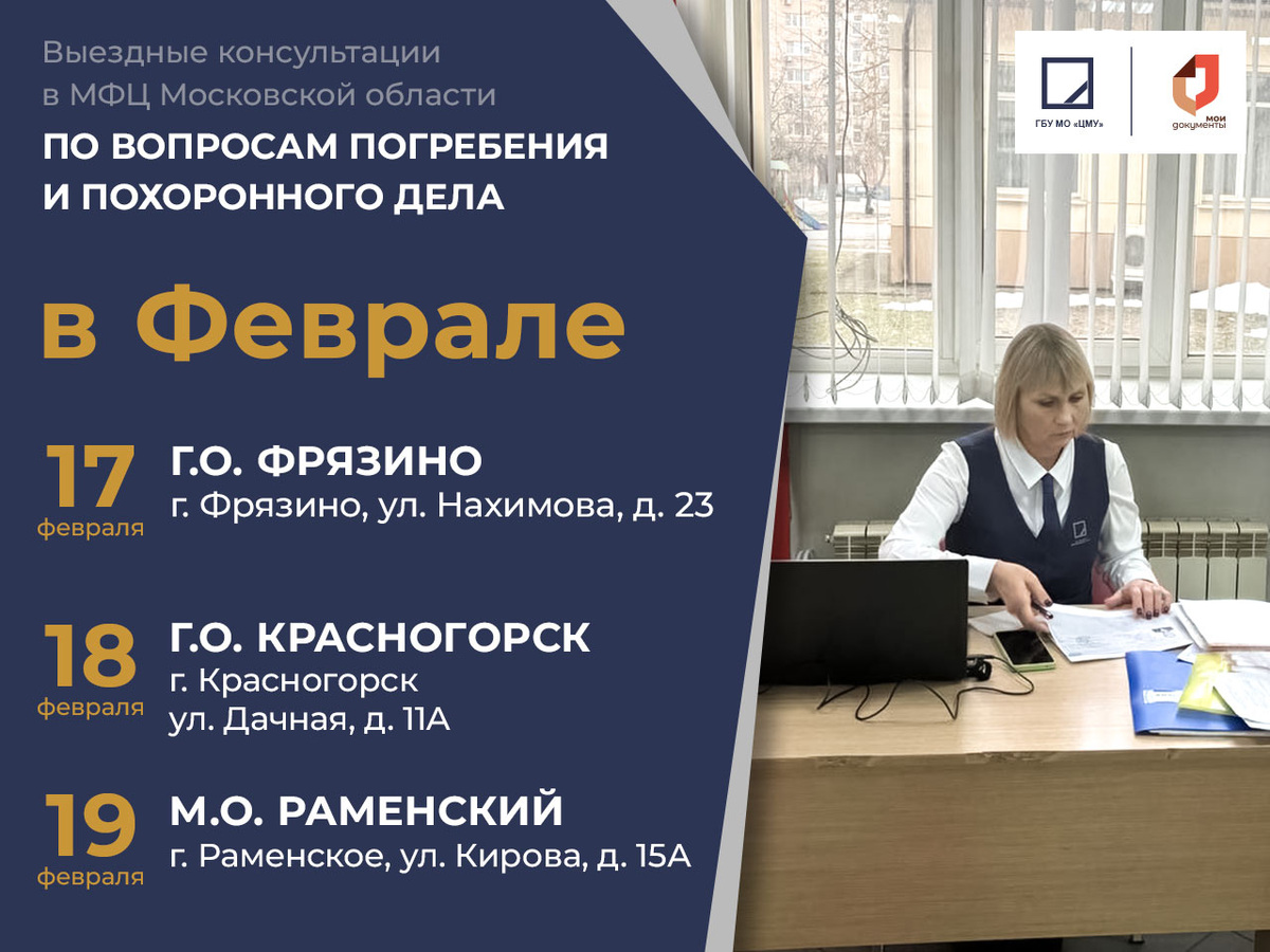 17 февраля - г.о. Фрязино, г. Фрязино, ул. Нахимова, д. 23 18 февраля - г.о. Красногорск, г. Красногорск, ул. Дачная, д. 11А 19 февраля - м.о. Раменский, г. Раменское, ул. Кирова, д. 15А 🔖Сохраняйте в закладках и не упустите возможность получить бесплатную консультацию в сфере погребения и похоронного дела в вашем городе. Также проконсультироваться по вопросам сферы погребения и похоронного дела или уточнить, где находится ближайшее отделение ГБУ МО "ЦМУ" можно по телефону круглосуточной горячей линии +7-498-568-99-99, а также на официальном сайте memorial.mosreg.ru. #гбумоцму #московскаяобласть #подмосковье #мо #погребение #похоронноедело #консультирование #консультация #бесплатнаяконсультация