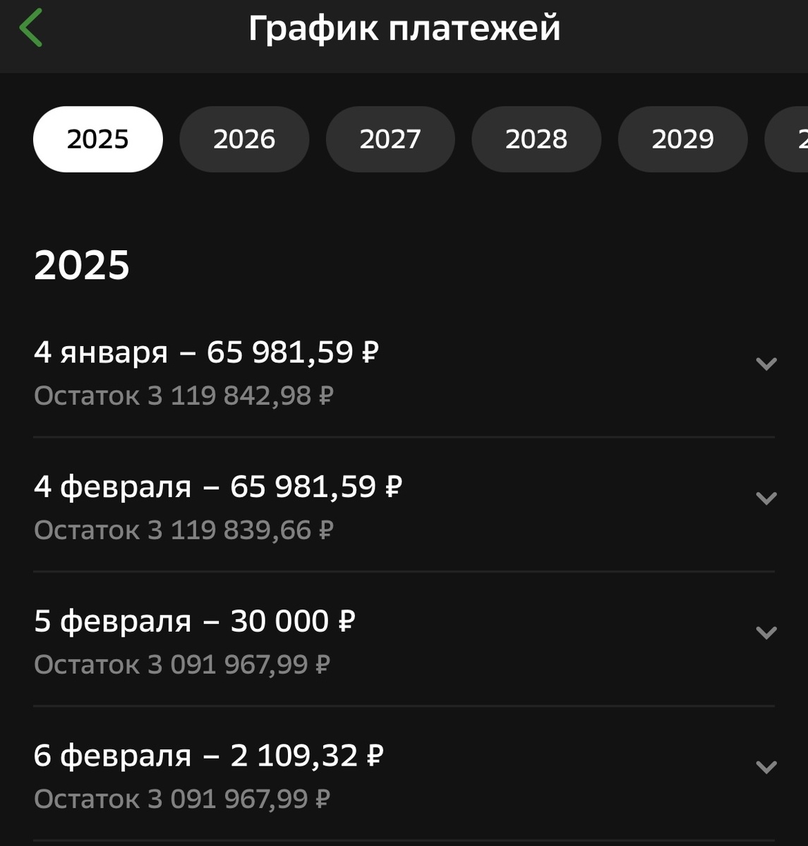 В начале феврале банк списал очередной ежемесячный платеж по ипотеке. И эту статью я хотела написать с самого 6го числа, именно тогда мы сделали первый досрочный платеж. Но у судьбы другие планы и ни свободного времени, ни вдохновения для написания текста не было. Напомню, что в декабре 2024 года мы с мужем взяли ипотеку. Первоначальные параметры были такие: О том, что мы будем вносить какие-то досрочные платежи я знала изначально. Несколько раз считала и пересчитывала варианты уменьшения задолженности на ипотечном калькуляторе. Если опираться на расчеты калькулятора, то даже дополнительные 5 тыс в месяц помогут ой как сильно сократить переплату по ипотеке. В целом, мы планируем вносить досрочные платежи в размере 30+ тысяч рублей. Что мы имеем сейчас: Вот так выглядит график уже свершившихся платежей. Больше всего меня радует то, как при оплате 30 000,00 рублей тело долга перешагнули за сотку. Так сказать минус один шаг. Когда я планировала вносить досрочные платежи, то хотела ум