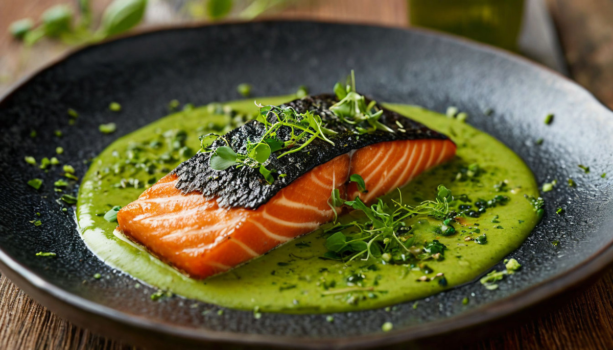 Этот изысканный рецепт лосося идеально подойдет для особого случая. Сочетание нежного лосося с хрустящей корочкой, освежающего крема из зеленого горошка и ярких ноток мяты создает неповторимую симфонию вкусов. Ингредиенты (на 2 порции): Для лосося: