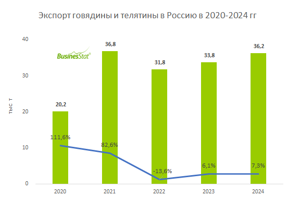 В 2020-2024 гг экспорт говядины и телятины из России увеличился в 1,8 раза: с 20,2 до 36,2 тыс т.