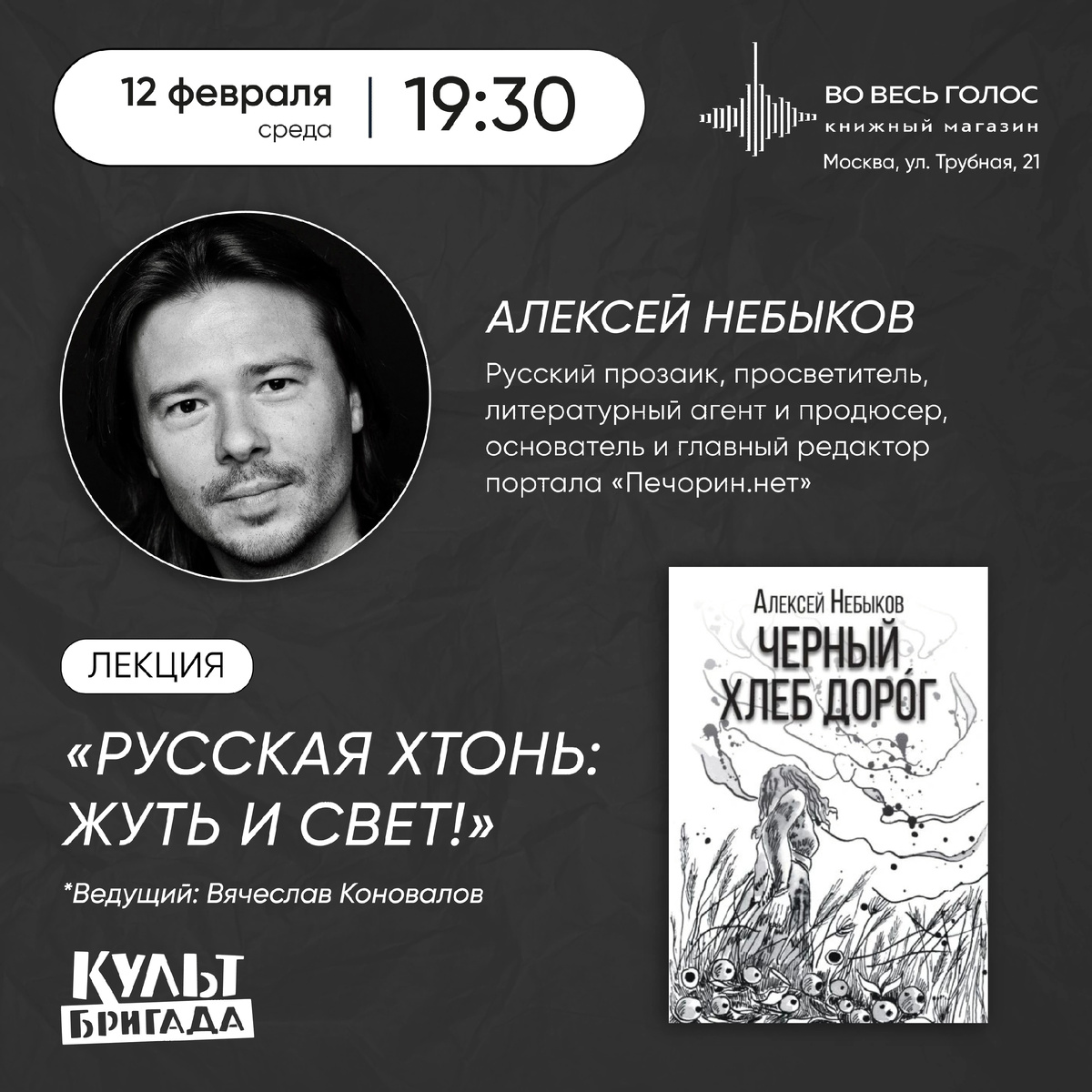 Вышедшая в 2024 году книга А. Небыкова «Чёрный хлеб дорог» уже нашла отражение в трёх видах искусства: музыка (композиция Алины Небыковой к рассказу «Ждана»), хореография (танец сестёр Виктории и Анастасии Михайлец) и изобразительное искусство (иллюстрации Алисы Бошко). Приглашаем вас на полное погружение в русскую хтонь завтра, 12 февраля, в 19:30. Также Алексей Небыков представит первый в серии «Время прозы» сборник рассказов «Маяки». Ведущий вечера — Вячеслав Коновалов, создатель проекта КультБригада, премий им. Арсеньева «Дальний Восток», «Главкнига», фестиваля «ЛИТР» и чеховского фестиваля «Остров Сахалин», в прошлом директор литературного журнала «Юность», а также многих других заметных проектов на литературном поле страны.