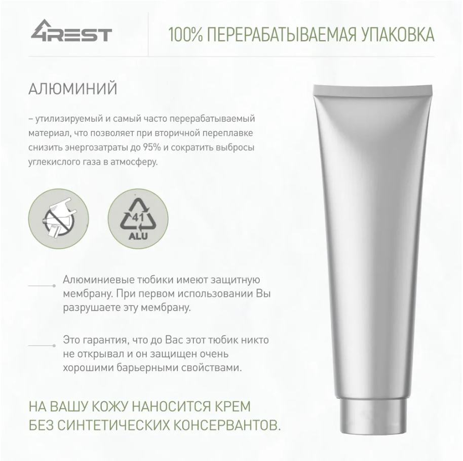 Мы в компании ФОРЭСТ (4REST) акцентируем внимание на гармонии с природой. Мы предлагаем продукты с натуральными ингредиентами, которые соответствуют строгим стандартам экологической безопасности и не тестируются на животных. Упаковка сделана из перерабатываемых материалов: мы используем алюминиевые тубы не только потому, что это стильно и удобно в использовании (крем в такой тубе не окисляется, в него не попадает грязь и бактерии), но это еще раз подчеркивает нашу ответственность за окружающую среду и стремление создать качественный и безопасный продукт для потребителей.