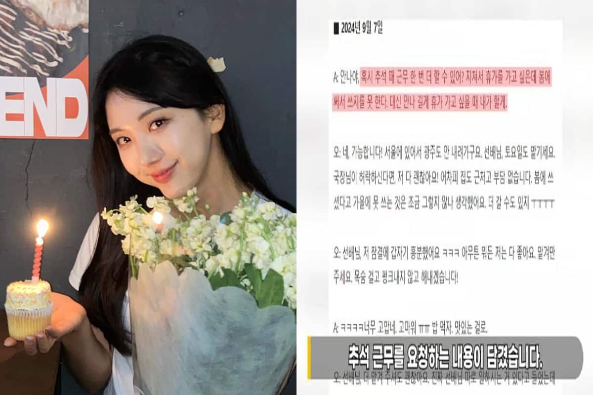 Согласно его информации, 7 сентября прошлого года коллега A написала О Ё Анне сообщение: «Анна, сможешь взять ещё одну смену на Чхусок? Я устала и хочу взять отпуск, но использовала его весной и теперь не могу.»