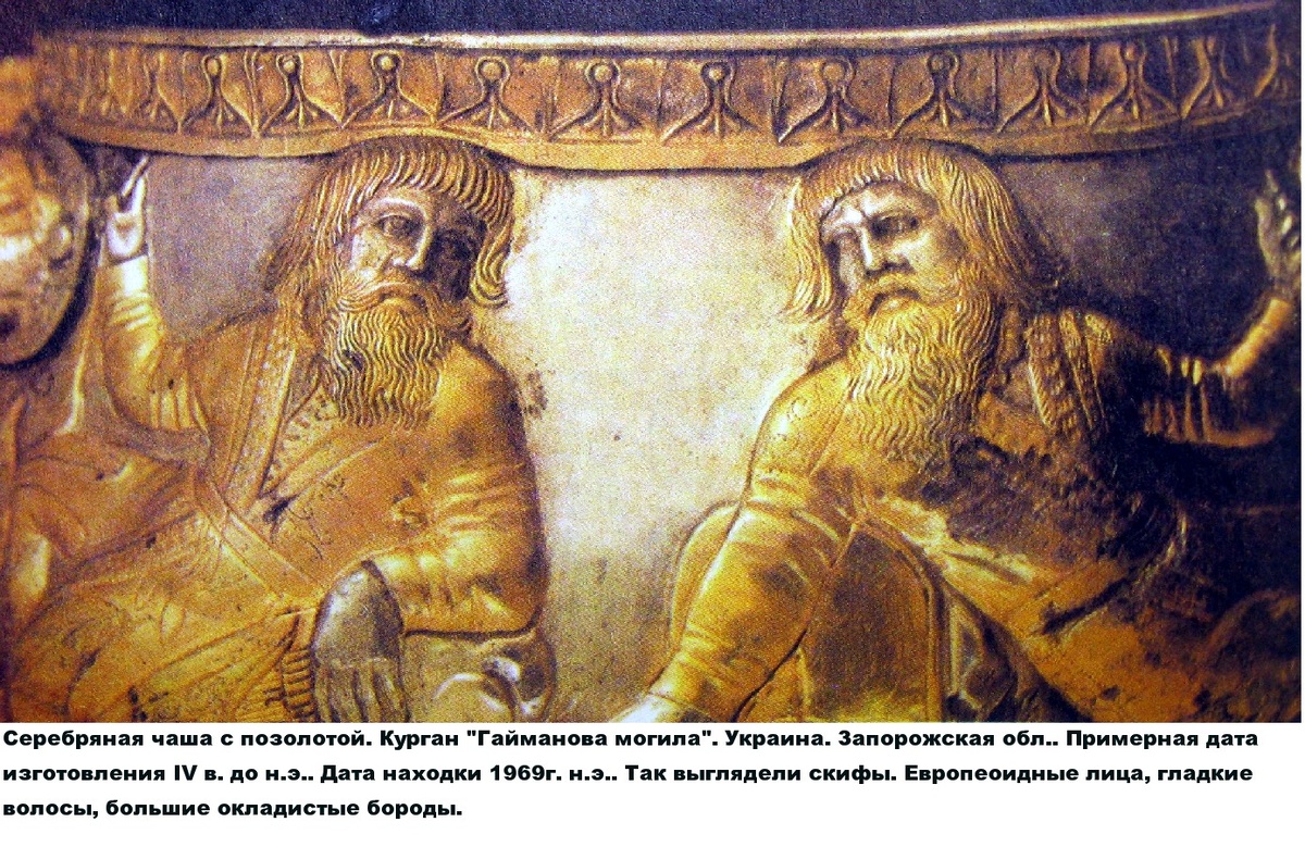 Как выглядели скифы? В скифском кургане “Гамайнова могила” недалеко от Киева найдена золотая чаша, на которой изображены "Царские скифы", которые в районе Киева и жили. (Иллюстрация: журнал "Наука и жизнь", №3 1970г., вторая страница вкладки). По изображению царские скифы имели типично славянские черты лица. Особенно характерными являются большие окладистые бороды. У народов монголоидной группы бороды растут плохо. Это наглядно подтверждает, что царскими скифами был европеоидный народ, более того, именно русские. Выше было показано, что традиция отращивать большие окладистые бороды неразрывно связана с использованием русской бани.