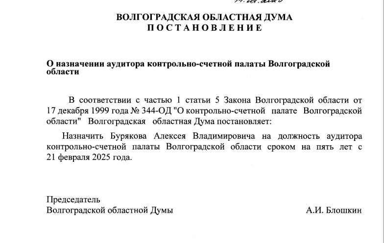 В соответствии с частью 1 статьи 5 Закона Волгоградской области от 17 декабря 1999 года № 344-ОД "О контрольно-счетной палате Волгоградской области", облдума постановила назначить Алексея Владимировича на должность аудитора контрольно-счетной палаты региона сроком на пять лет с 21 февраля 2025 года.
